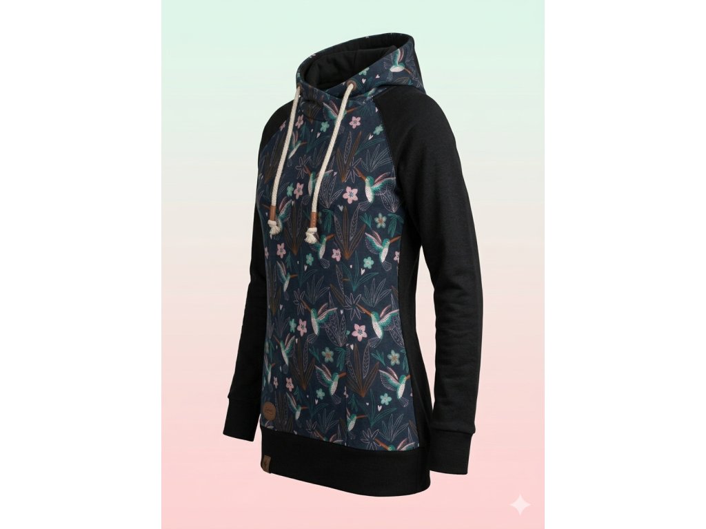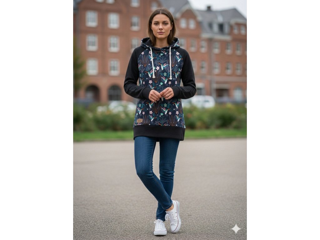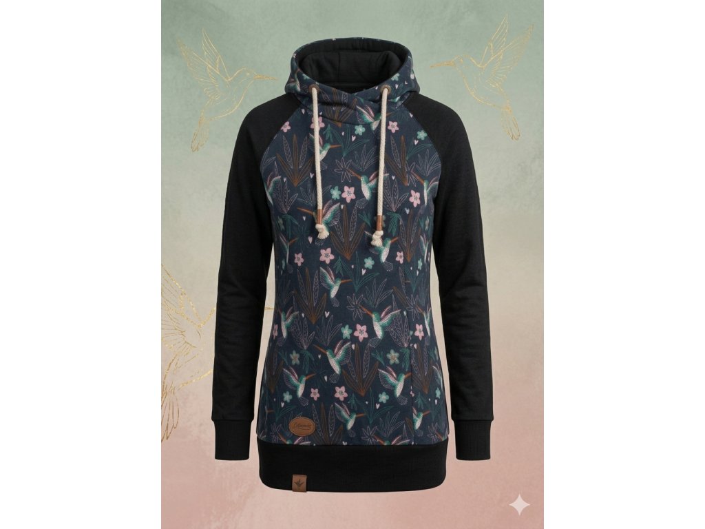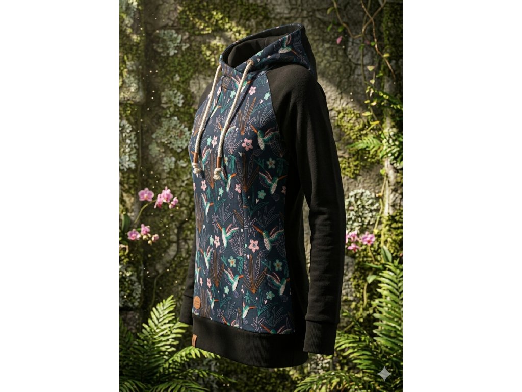 Jemný motiv s kolibříkem v kombinaci s černými rukávy vytváří jedinečný model, který zaujme na první pohled.