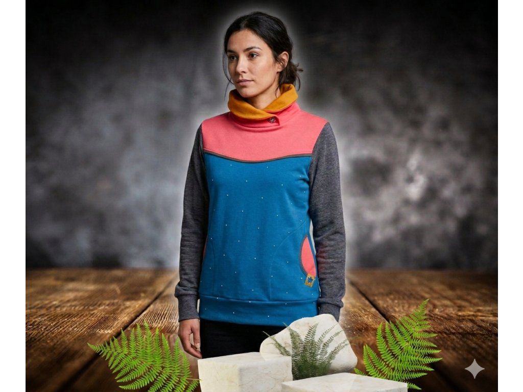 Originální barevná kombinace, jemný puntík na petrolejové, lososová a hořčicová teplákovina a příjemná šedá žebrovaná teplákovina na rukávech.