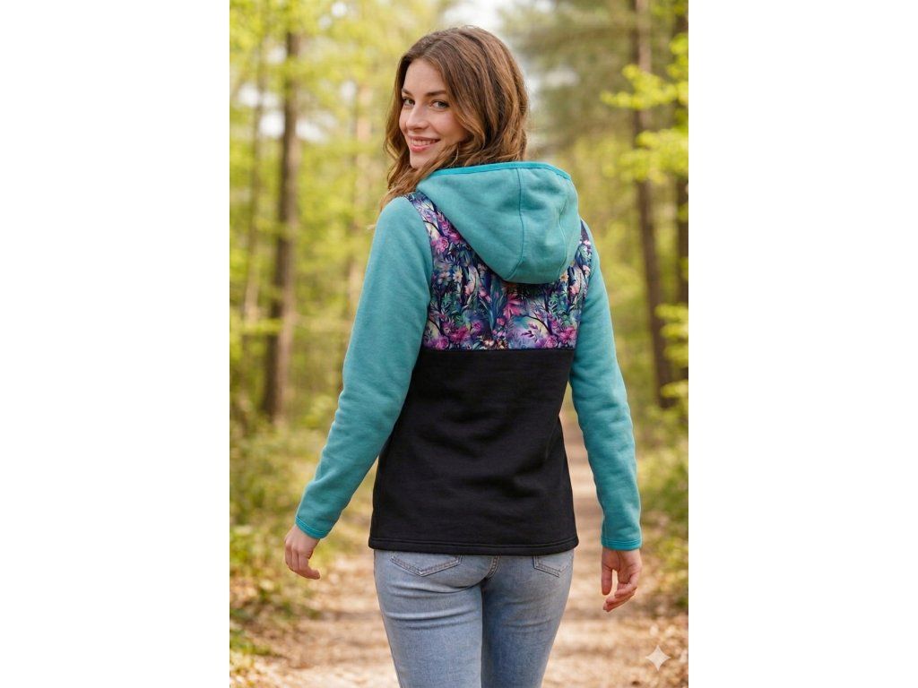Tato bunda kombinuje černý a tyrkysově modrý softshell s půvabnými barevnými kvítky na sedle.