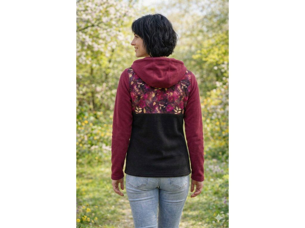 Tato bunda kombinuje černý a vínový softshell s vínovo - zlatýmu lístečky na sedle.