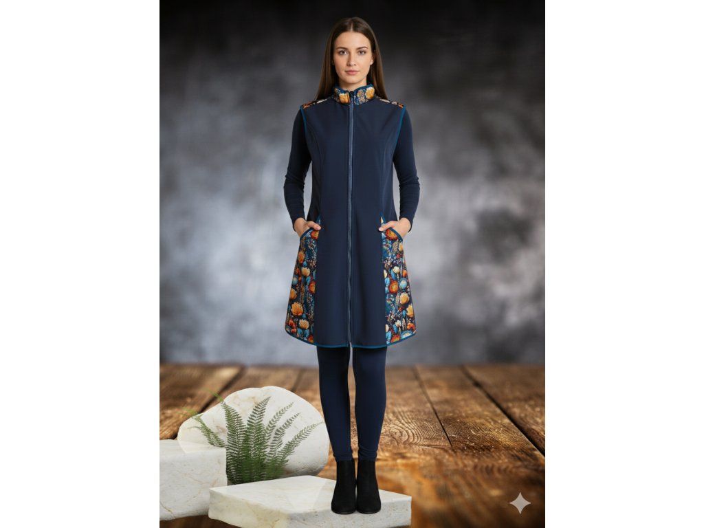 Disponuje praktickými hlubokými kapsami, projmutým střihem a stojáčkem
