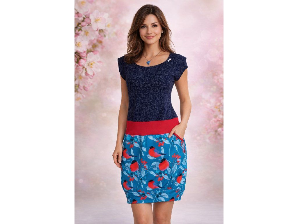 Nabízím půvabné letní šaty s praktickým střihem a krásným potiskem červených ptáčků - hýlů.