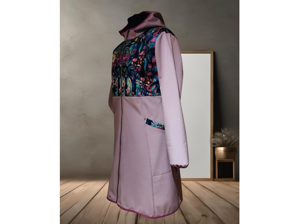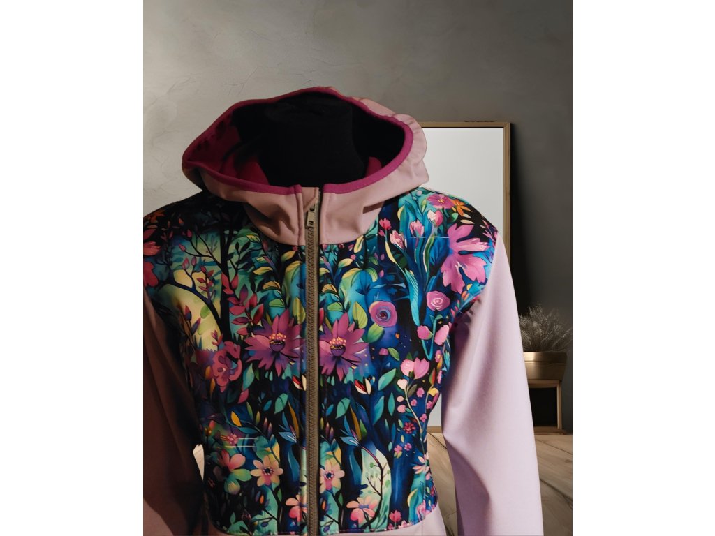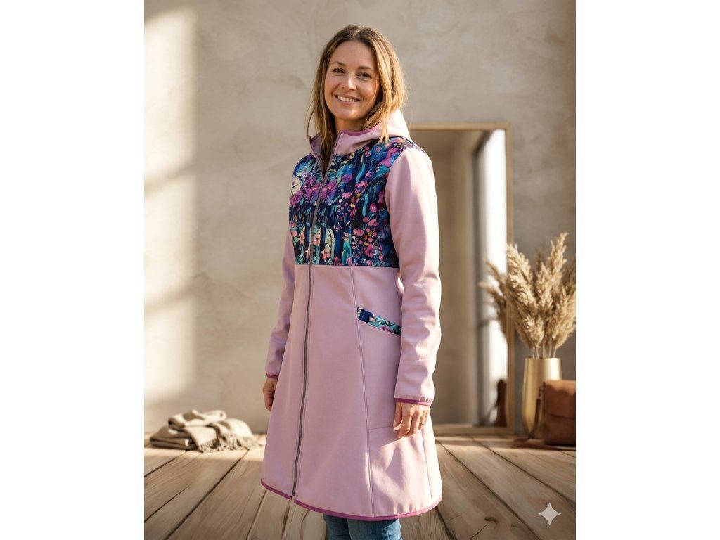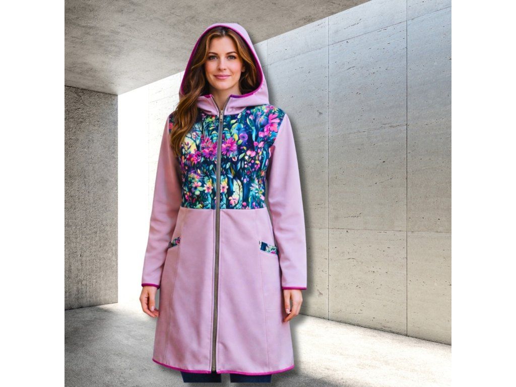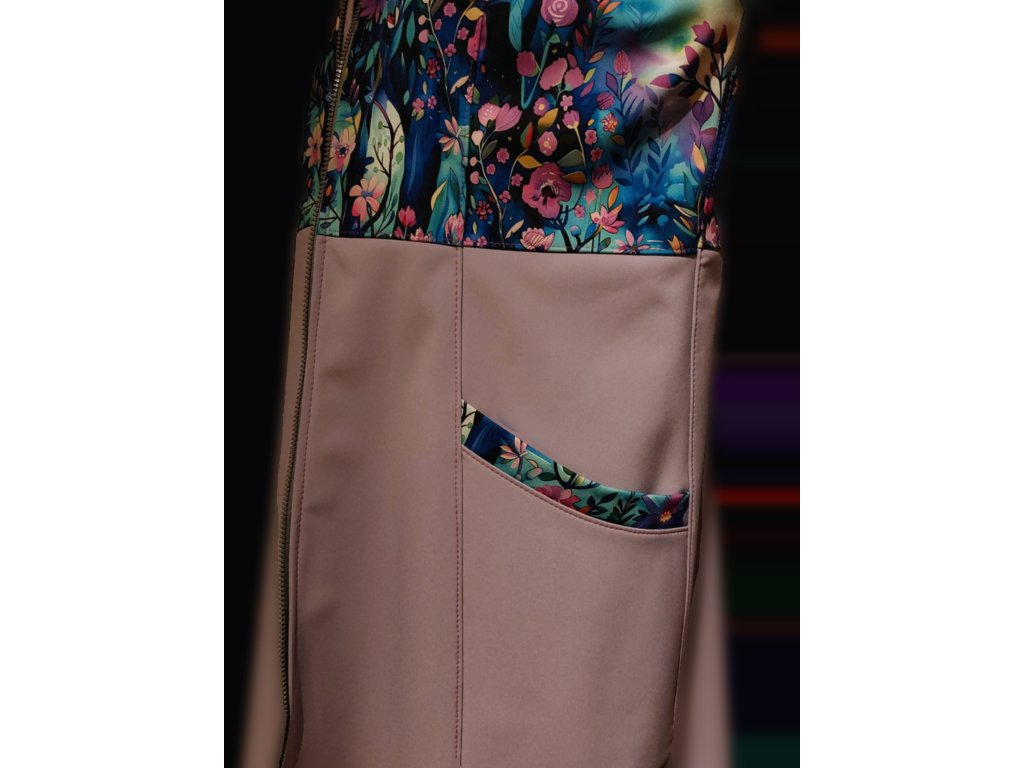 Tento orignální model kombinuje levandulový softshell s tištěným motivem pestrého kvítí.