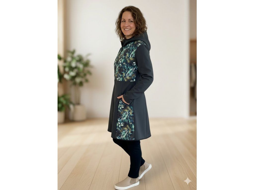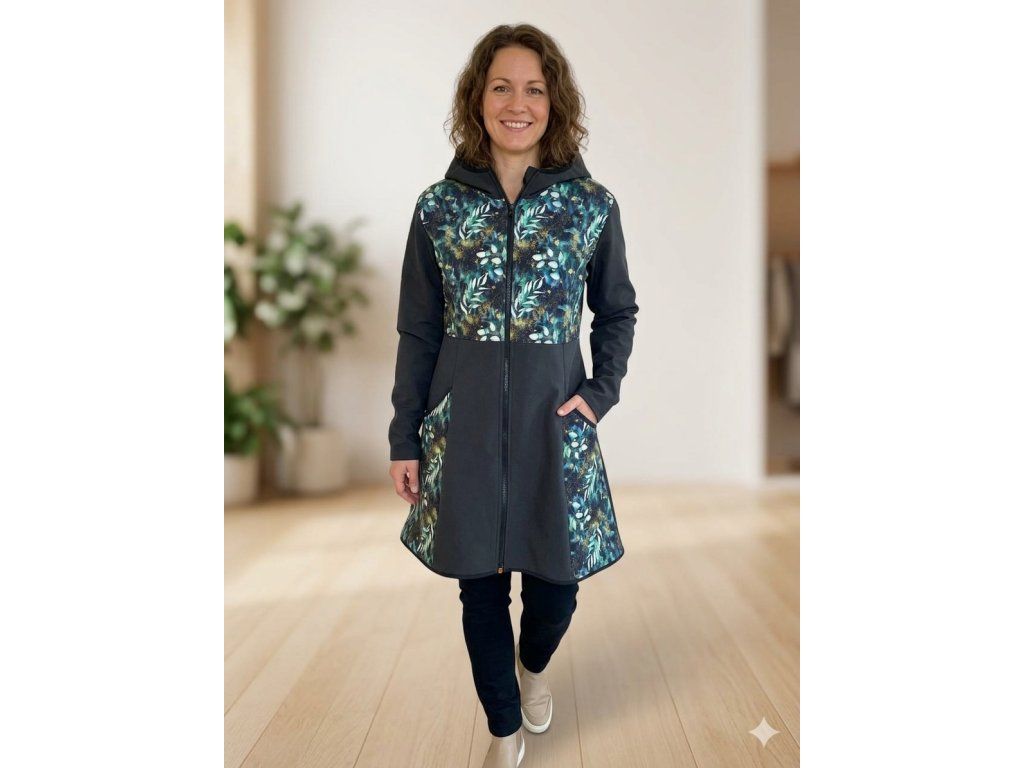 Jedinečná barevná kombinace černého softshellu a tištěného softshellu s jemným motivem eukalyptu podtrhuje originální autorský návrh, který nevzniká sériově, ale s důrazem na detail a osobní přístup.