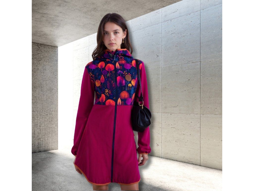 Tento orignální model kombinuje vínový softshell s tištěným motivem barevných stromů.