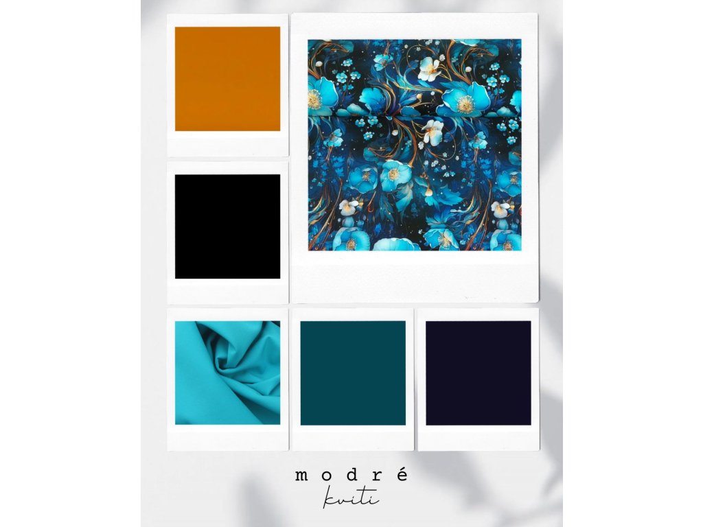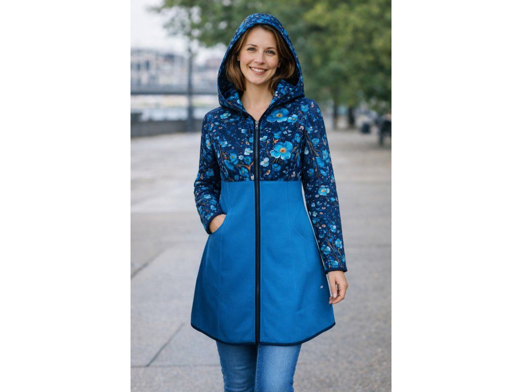 Tento orignální model kombinuje blankytně modrý softshell s půvabným motivem modrého kvítí.