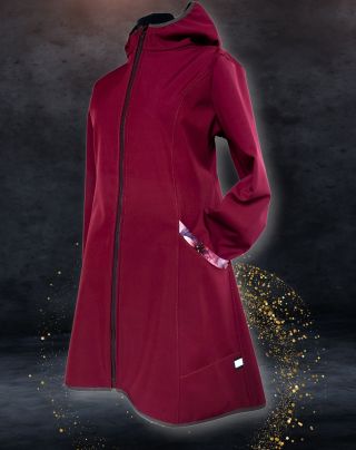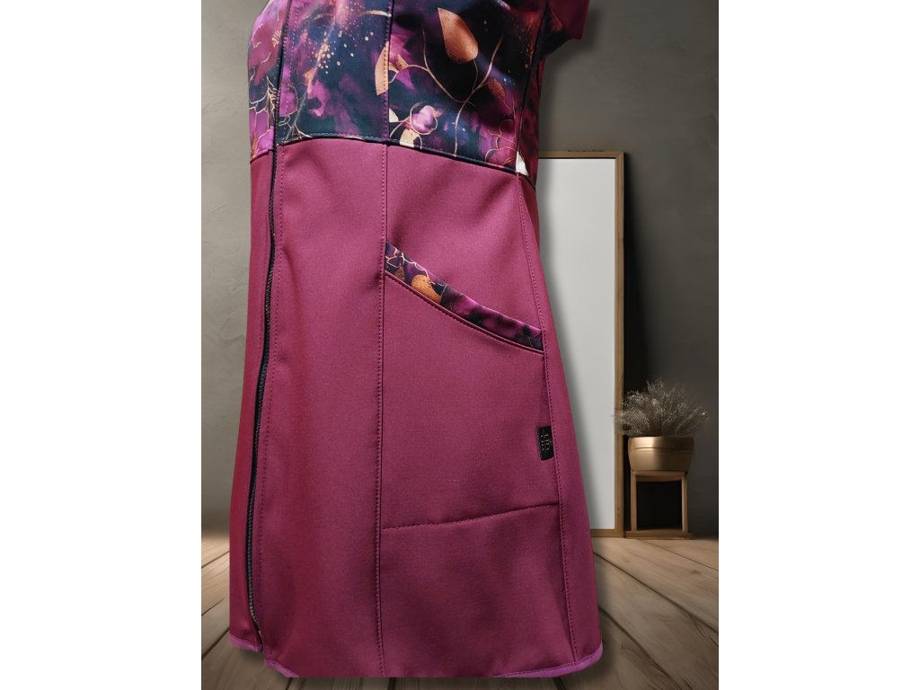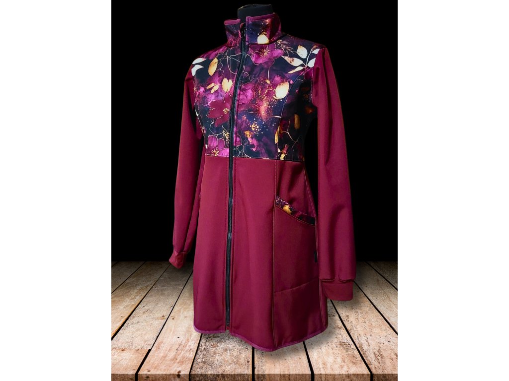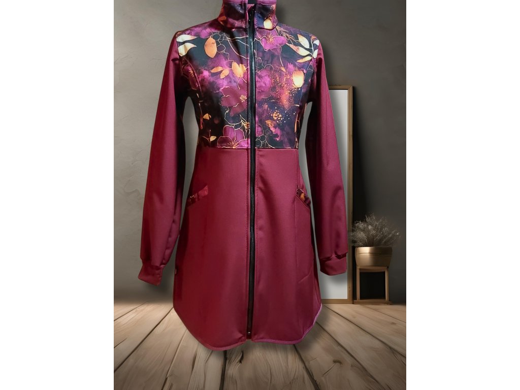 Tento orignální model kombinuje vínový softshell s tištěným motivem vínově-zlatavých lístečků.