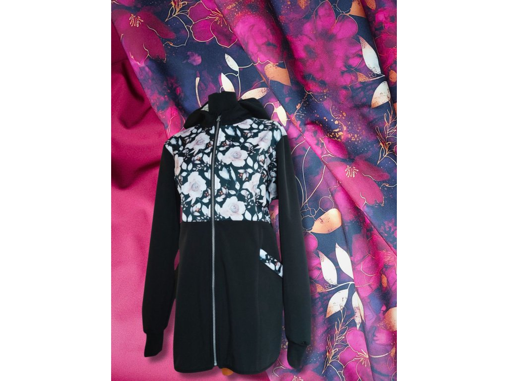 Tento orignální model kombinuje vínový softshell s tištěným motivem vínově-zlatavých lístečků.
